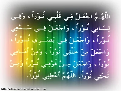 Ya Allah, jadikanlah cahaya di hatiku,cahaya dilidahku,cahaya di pendengaranku cahaya di penglihatanku,cahaya dari belakangku, cahaya dari mukaku,cahaya dari atasku dan cahaya dari bawahku. Ya Allah, berilah aku cahaya” (HR. Muslim 1/530 dan lafal hadist ini menurutnya, dan Al-Bukhari)